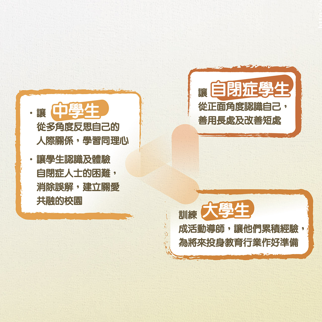 1. 中學生從多角度反思自己的人際關係,學習同理心;認識自閉症人士的困難,消除誤解,建立關愛共融的校園。