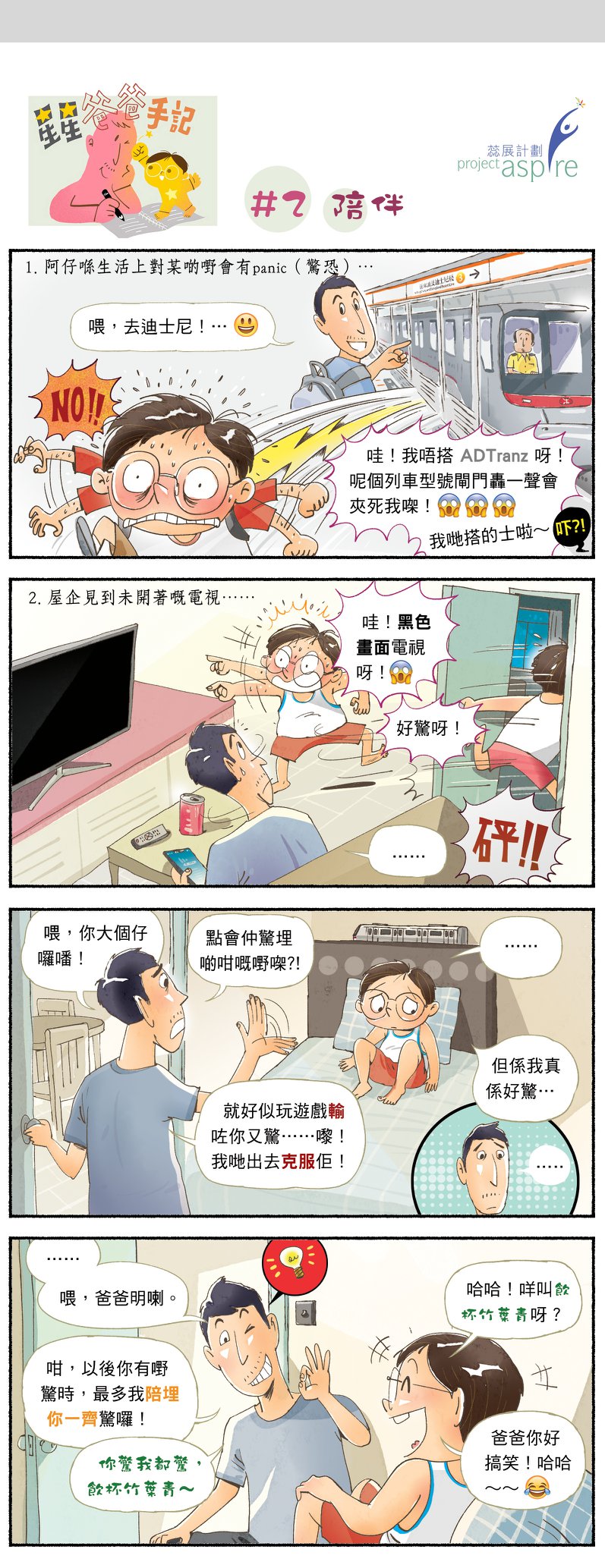 不知道是否大部份ASD小朋友都會有一些「古怪」行為,或可稱為「怪癖」?故事中小朋友好害怕乘搭某類型號的港鐵列車,又好怕見到關機中的電視屏幕。大人無論怎樣解釋加安撫,甚至連小朋友自己都可以理性地去理解,但,總之就是害怕。