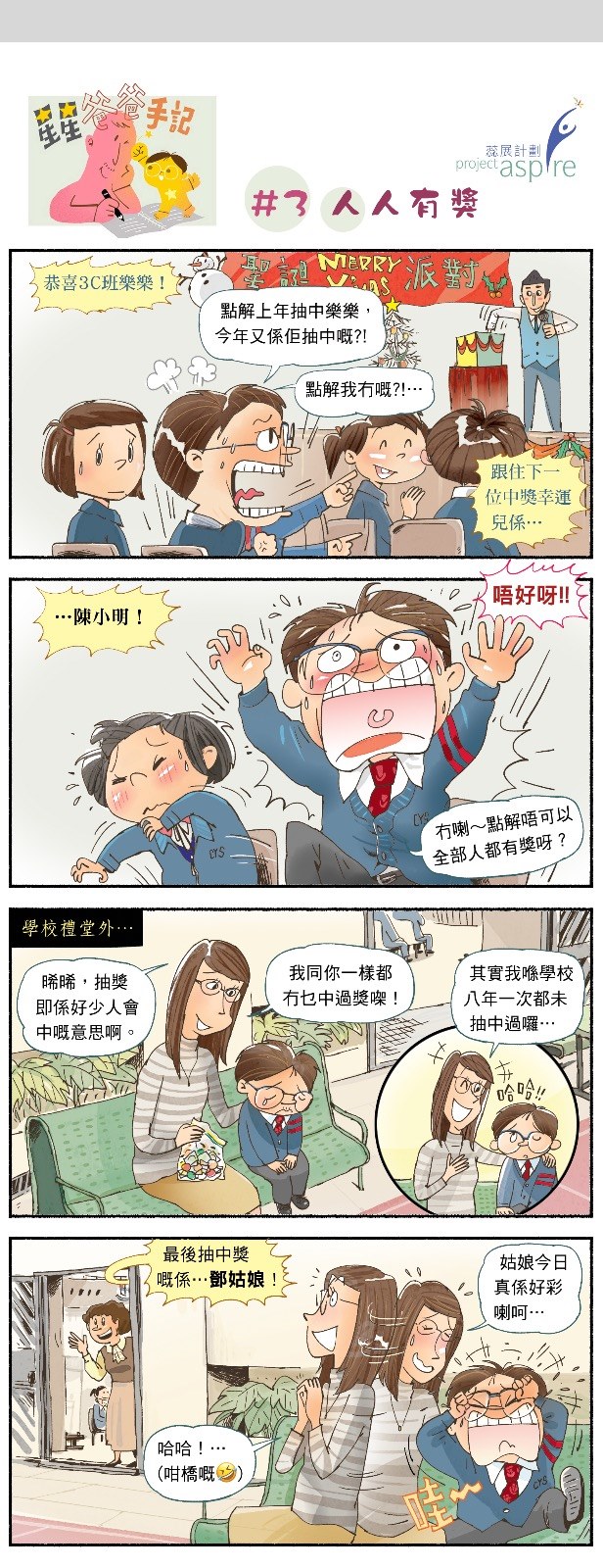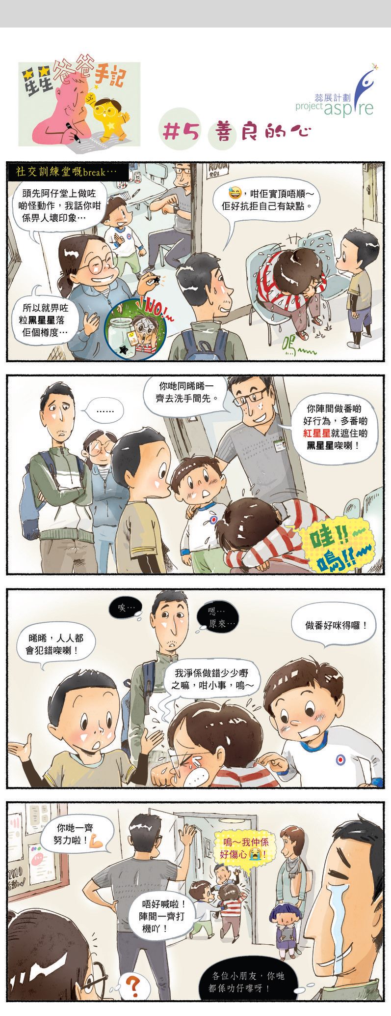 這個漫畫故事是年前的經歷。孩子在社交訓練堂上遇到解不通的事,驚惶失措(準確點是失控~);同學竟然很關心他安慰他,說著一些打氣的說話—我在場看到覺得很匪夷所思!
