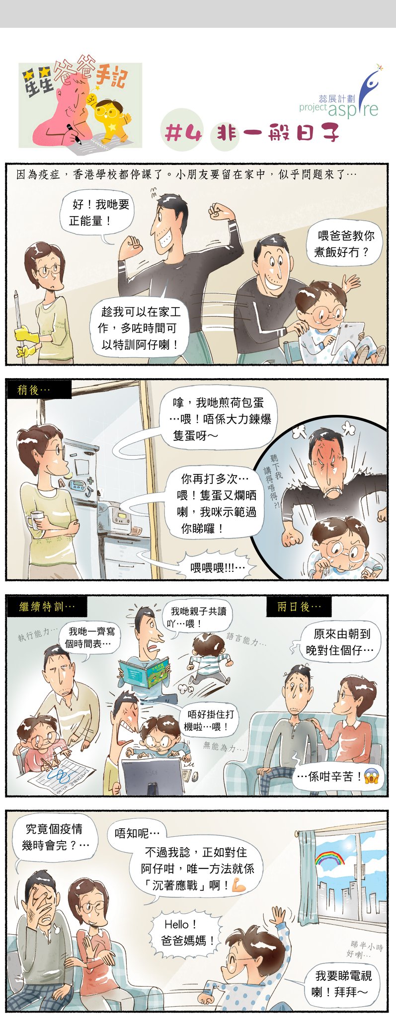 我覺得這段時間不如好好靜心去了解一下子女,或者會有更多啟發和體會。無論他們獨特的脾性、行為、甚至所思所想,都可以讓父母更懂得跟子女相處,而不時常常充滿衝突。