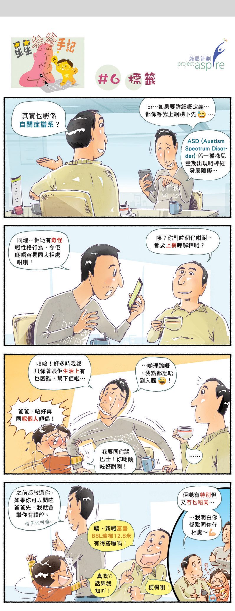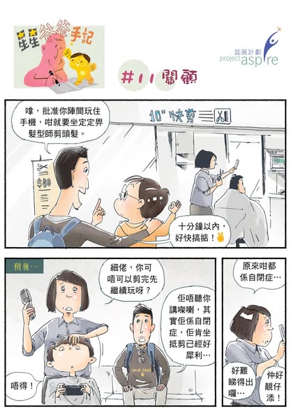 作為爸爸的我,跟兒子長時間相處,當然會發現他們譜系內的一些行為會很相似,亦都會想辦法針對某些有機會阻礙他們發展和生活的行為協助他作出改善,歸根究底都是想他們往後成長能過得開心順利一點;另一方面,我自己都常反省,會有哪些地方是誤解了他?他們並不是我們所看見的封閉?